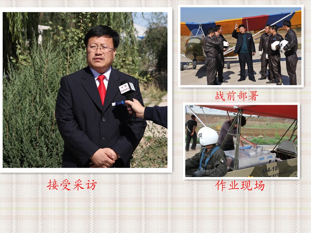 ,而是毅然決然的走上里一條充滿艱辛的打拼之路,在別人笑之為天方夜譚的情況下,1999年四處投親靠友籌集資金從北京航空航天大學購進了一架蜜蜂4超輕型飛機,與此同時它成就了內(nèi)蒙古自治區(qū)第一個私人擁有飛機的人,飛機有了,他東奔西走,開始學習、探索、研究制作超輕飛機飛機播種和飛機滅蟲設備,經(jīng)過4年的反復試驗,終于在2003年設備試驗成功,但沒有相關(guān)手續(xù)私人飛機不允許私自飛行,于是成立航空公司的想法在心中勾畫,他開始了中國第一家超輕型飛機通用航空公司的籌建工作,一己之力不可成江河,于是他伙同一直支持他的妻子四處請專家、找能人,終于在2006年經(jīng)過三年努力國家民航華北地區(qū)管理局為其頒發(fā)了通用航空公司籌建許可證,于是他又四處籌措資金,投入到籌建工作之中,2008年六月經(jīng)民航華北地區(qū)管理局驗收合格并頒發(fā)通用航空運營許可,與此同時他的飛機播種、飛防滅蟲兩項實用新型專利獲得通過,國家知識產(chǎn)權(quán)局頒發(fā)了實用新型知識產(chǎn)權(quán)證書。(鏡頭七)設備特寫(包括專利證書)邱志剛一個不屈不撓的東北漢子,在平凡的人生道路上創(chuàng)造了不平凡的業(yè)績,創(chuàng)造了不平凡的人生價值。創(chuàng)造了人生的豪邁與神奇。